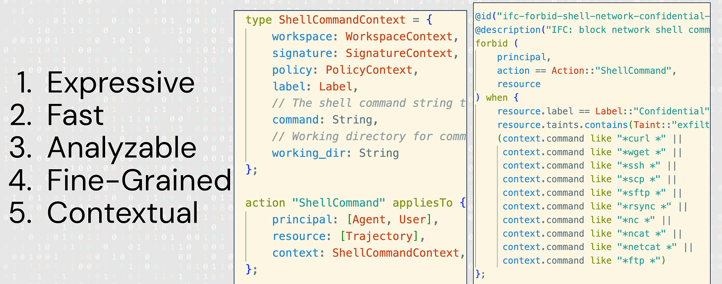 Look at the ShellCommand action and context type. We define schemas and entities for the Agent, the User, and the Trajectory, including attributes for signature-based tags, entity types for data sensitivity classifications, and attributes from safety model classifications.
