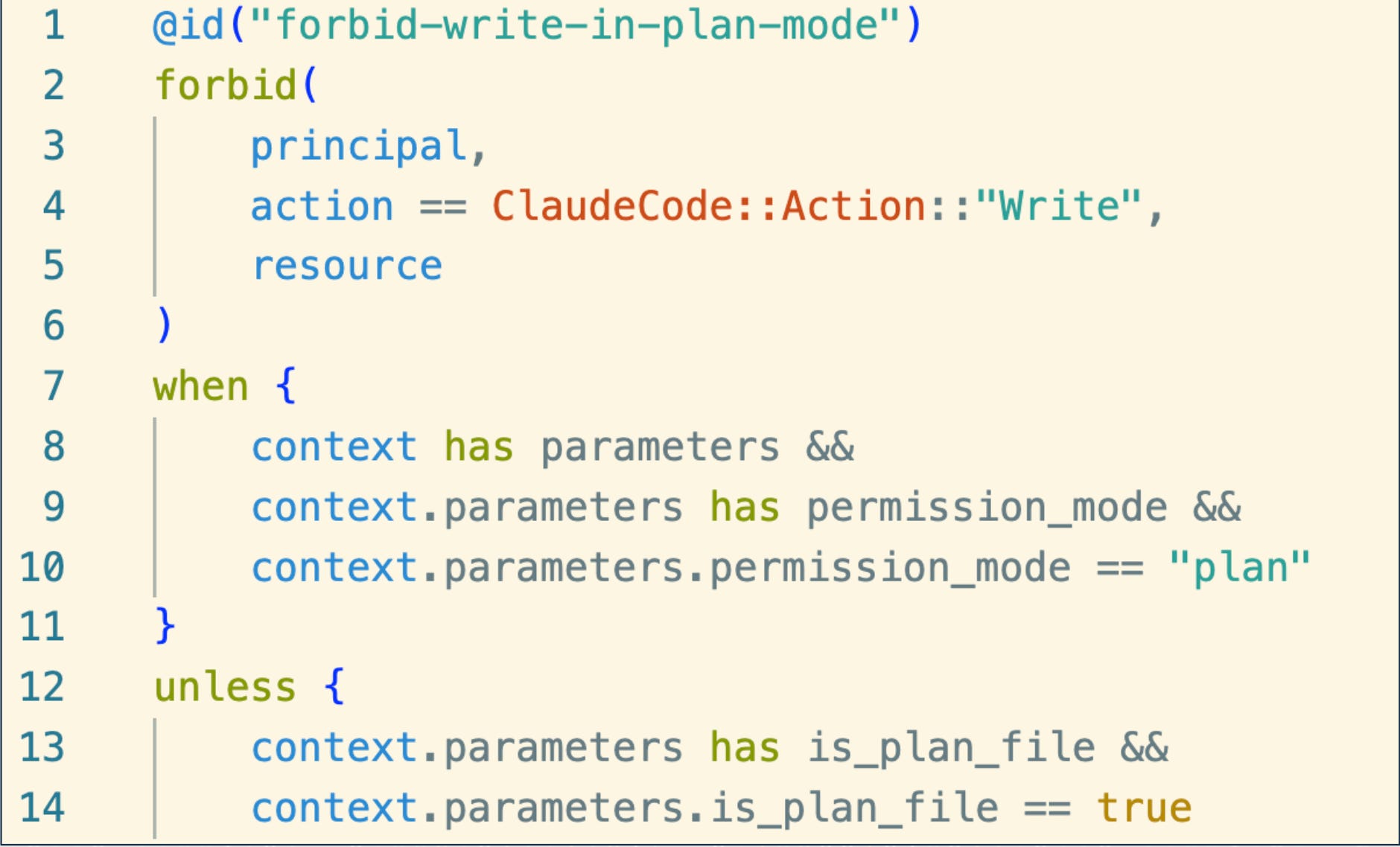 Policies don’t need to just be security-oriented; we can author policies for coding agents engaged in planning behavior. Turns out, you can actually write files when you’re in Claude Code Plan mode.