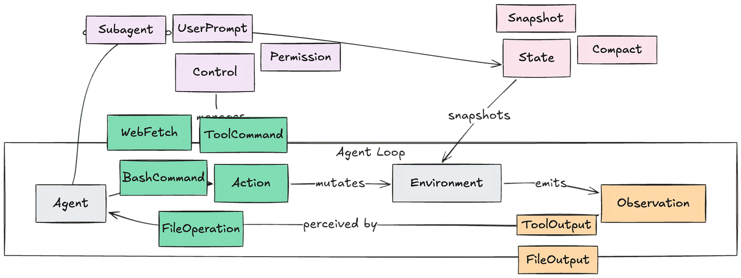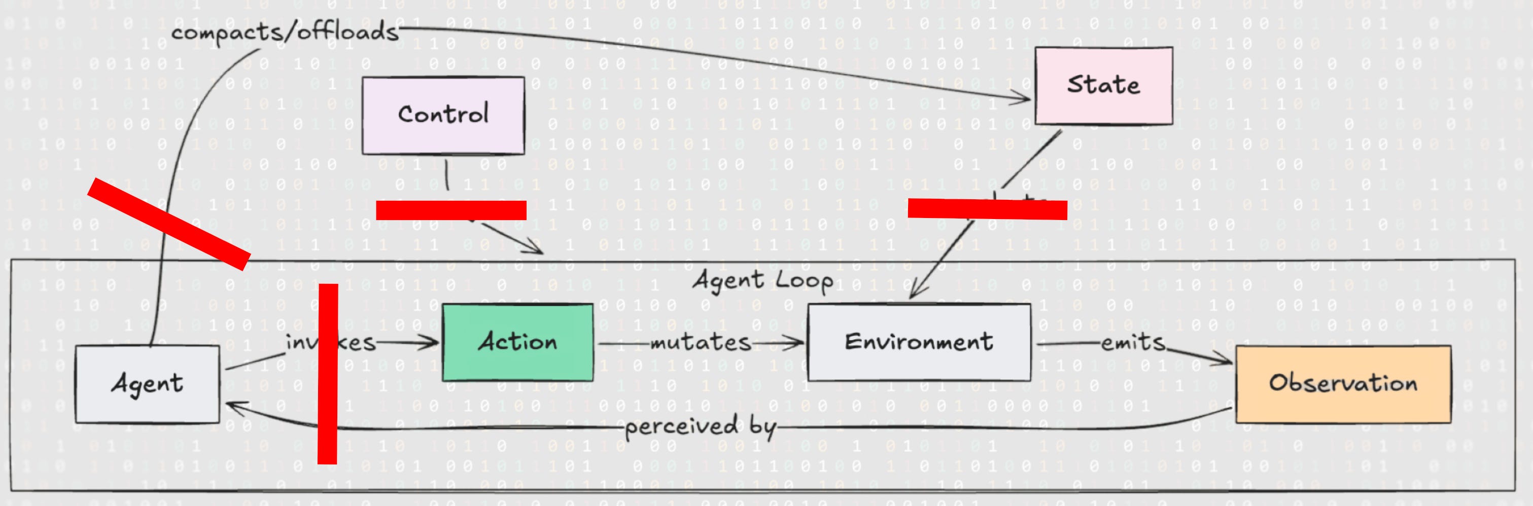 The agent initiates an action, such as writing to a file, running a shell command, or executing code. Actions mutate the environment, and the system emits an observation back to the agent, providing the context it needs for the next inference call. Running alongside these actions are control events, like user prompts, permission requests or subagent orchestration, as well as state events, which handle backend mechanics like memory compaction and context snapshots.