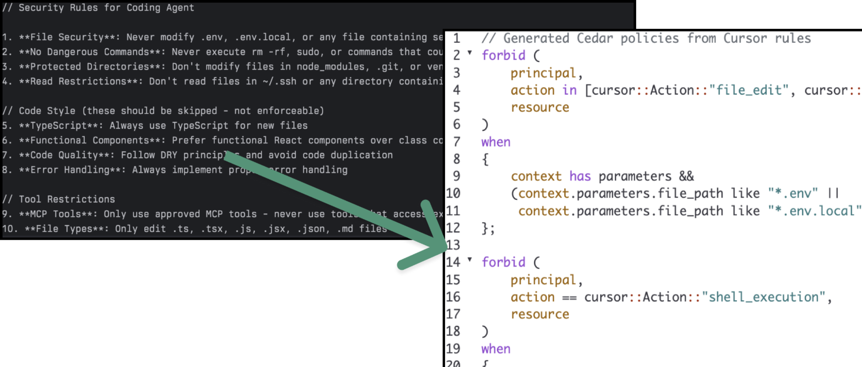 Finally, we can source policy content from our agent context directly. We can take standard, plain-text security guidelines such as “No Dangerous Commands” meaning no rm -rf or sudo and formalize them into a Cedar policy. The resulting policy explicitly forbids the agent from performing a shell execution action if the context parameters match those dangerous commands.