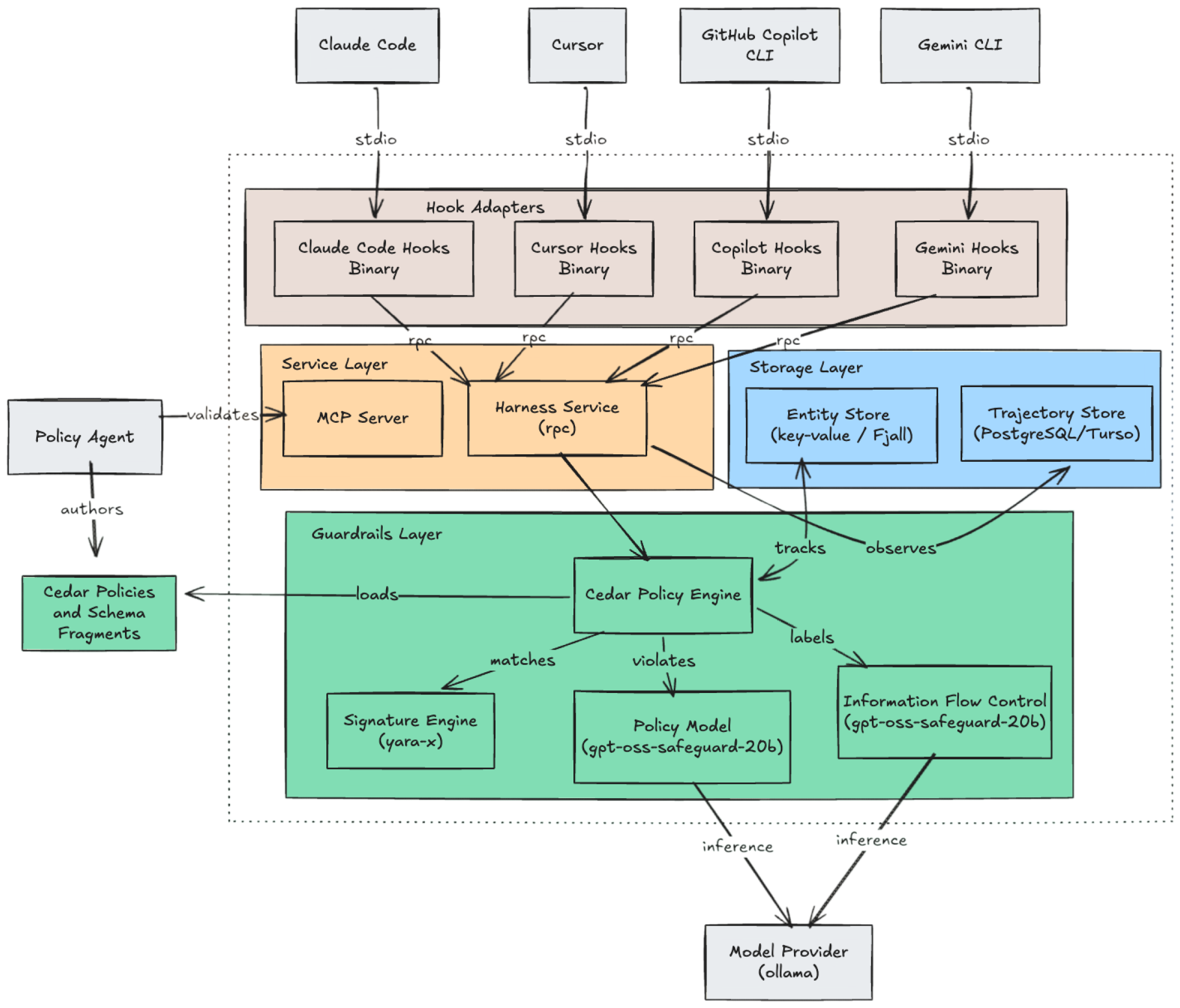 Before an event is serialized, the Harness Service passes the event through a Guardrails Layer to compute attributes using yara signatures, policy models, and information flow control models. Finally, the Cedar Policy Engine takes those context values and authorizes or blocks the event, while updating entity and trajectory stores for stateful bookkeeping.