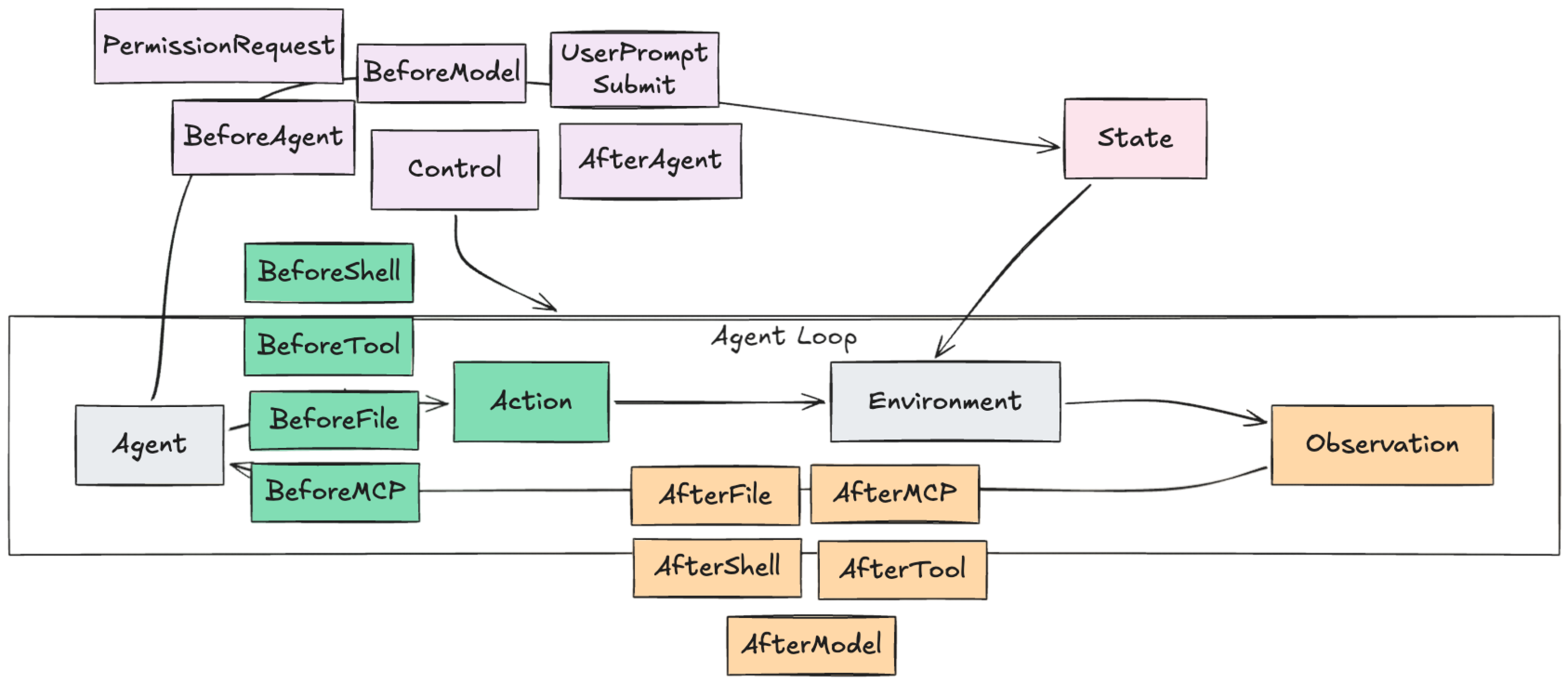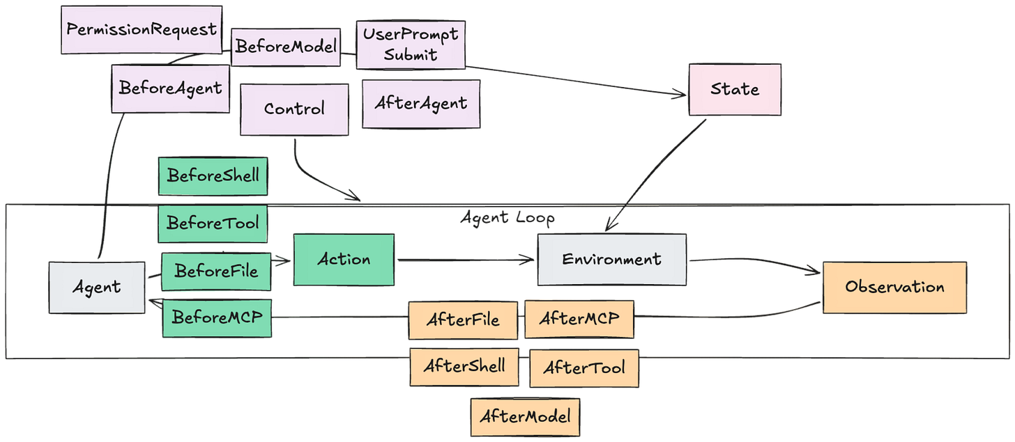 Hooks allow us to intercept these trajectory events, process them, and decide whether to allow, modify, or stop the agent’s loop. They are invoked at different lifecycle events.
