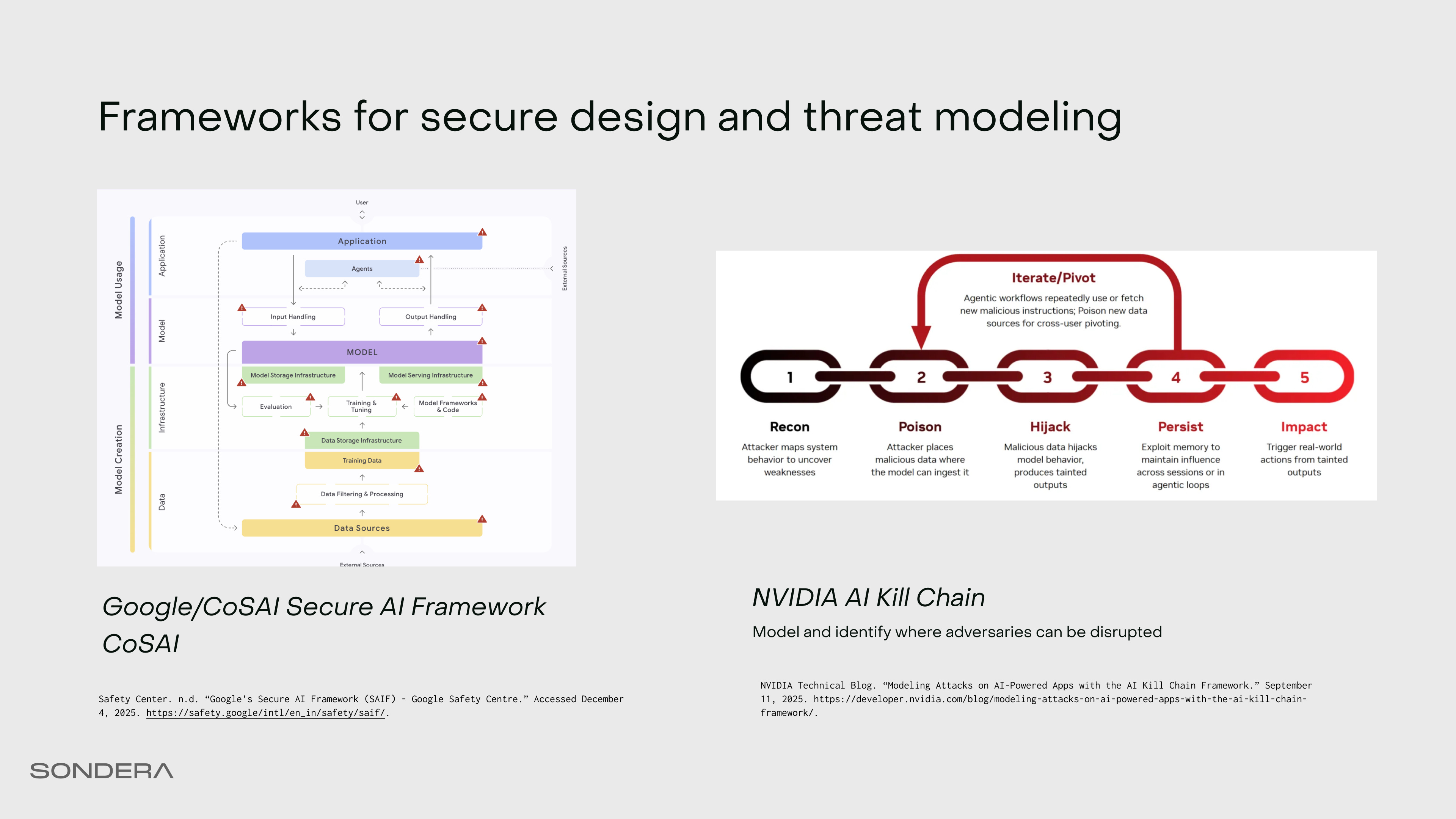 The Secure AI Framework (now maintained in Coalition for Secure AI) defines an architecture showing where agents fit into model use versus model creation. On the threat modeling side, there’s the AI Kill Chain from NVIDIA. This are many threat, vulnerability, and control framework resources from OWASP including OWASP Top 10 for LLMs and the OWASP Top 10 for Agents which is to be released later this month. Also check out parallel work like MITRE ATLAS, MAESTRO and the Amazon Agentic Scoping Matrix.