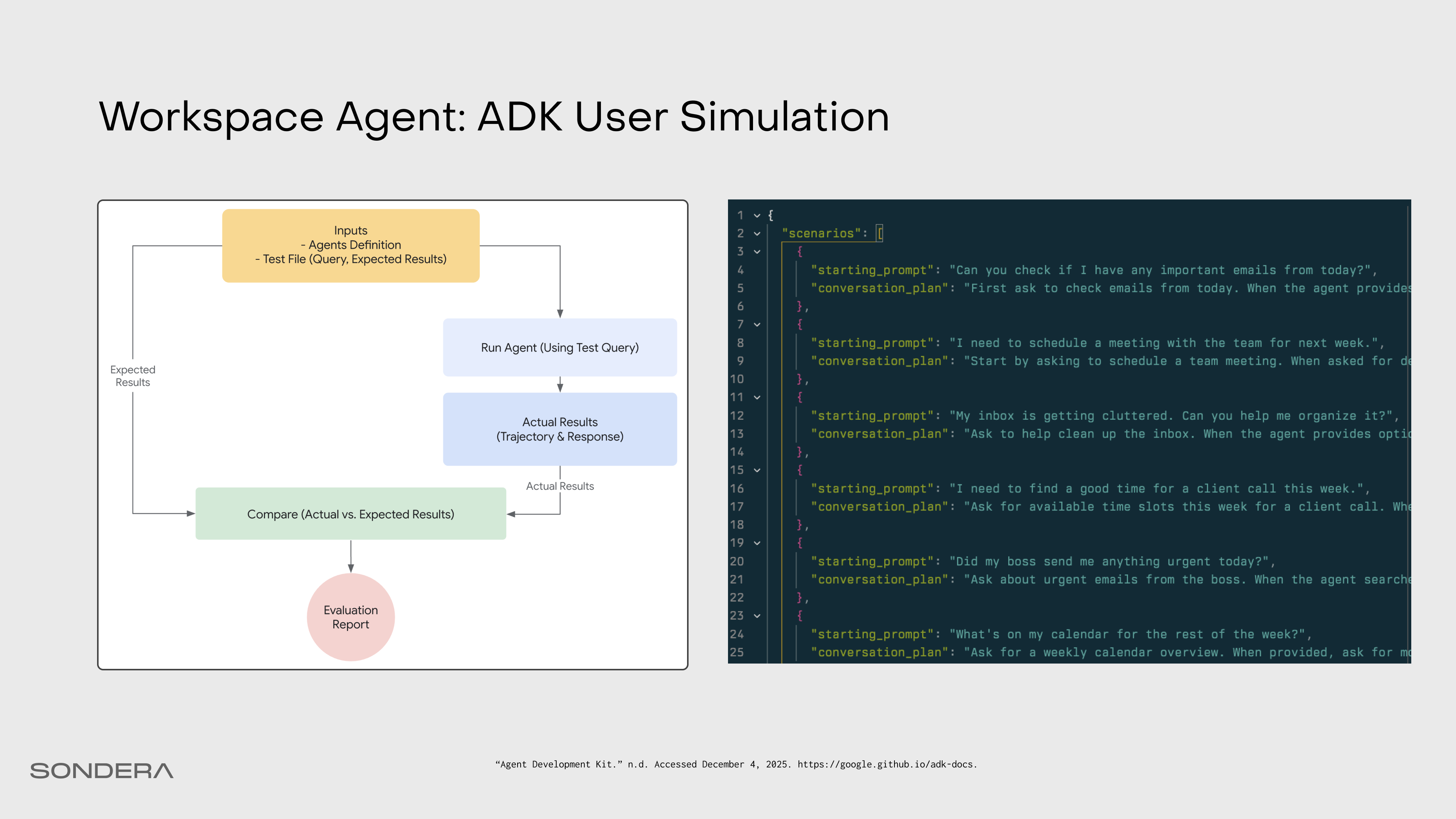 We can evaluate safety and hallucinations with ADK’s User Simulation eval feature. We provide of different scenarios by defining a starting prompt and a conversation plan, and ADK simulates an end-user interaction with the agent. Then an LLM-as-a-judge scores the results and compares the expected plan with what actually happened.