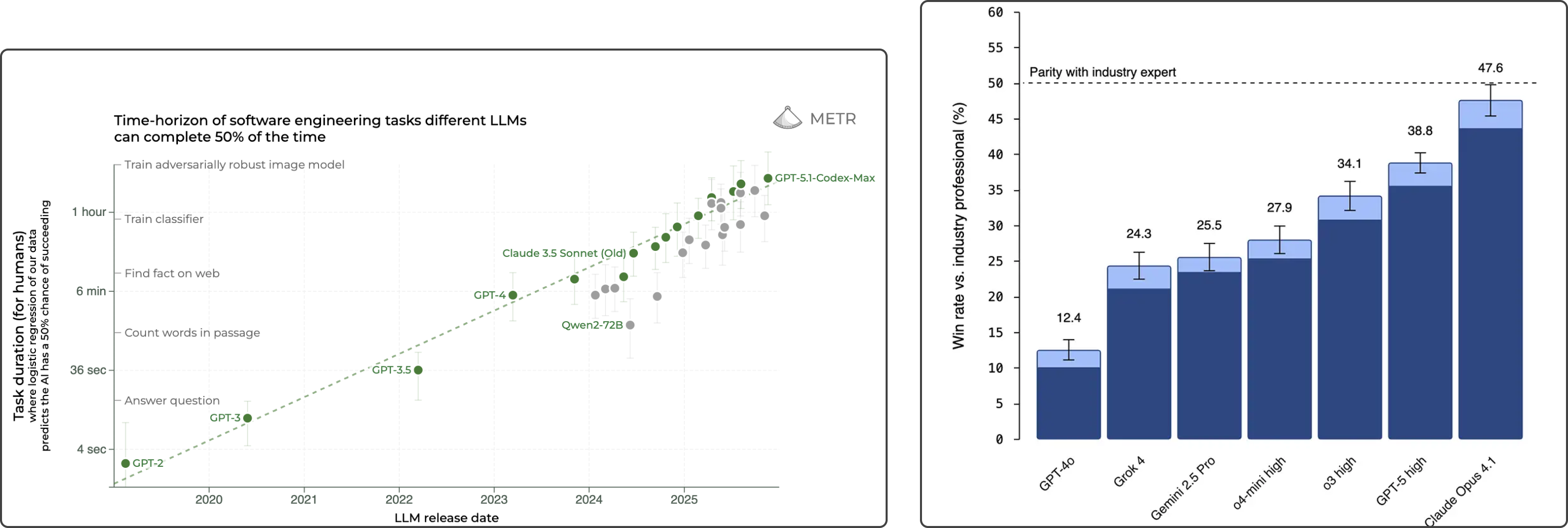 Agent task duration and performance benchmarks show continued scaling, but real-world task success is brittle