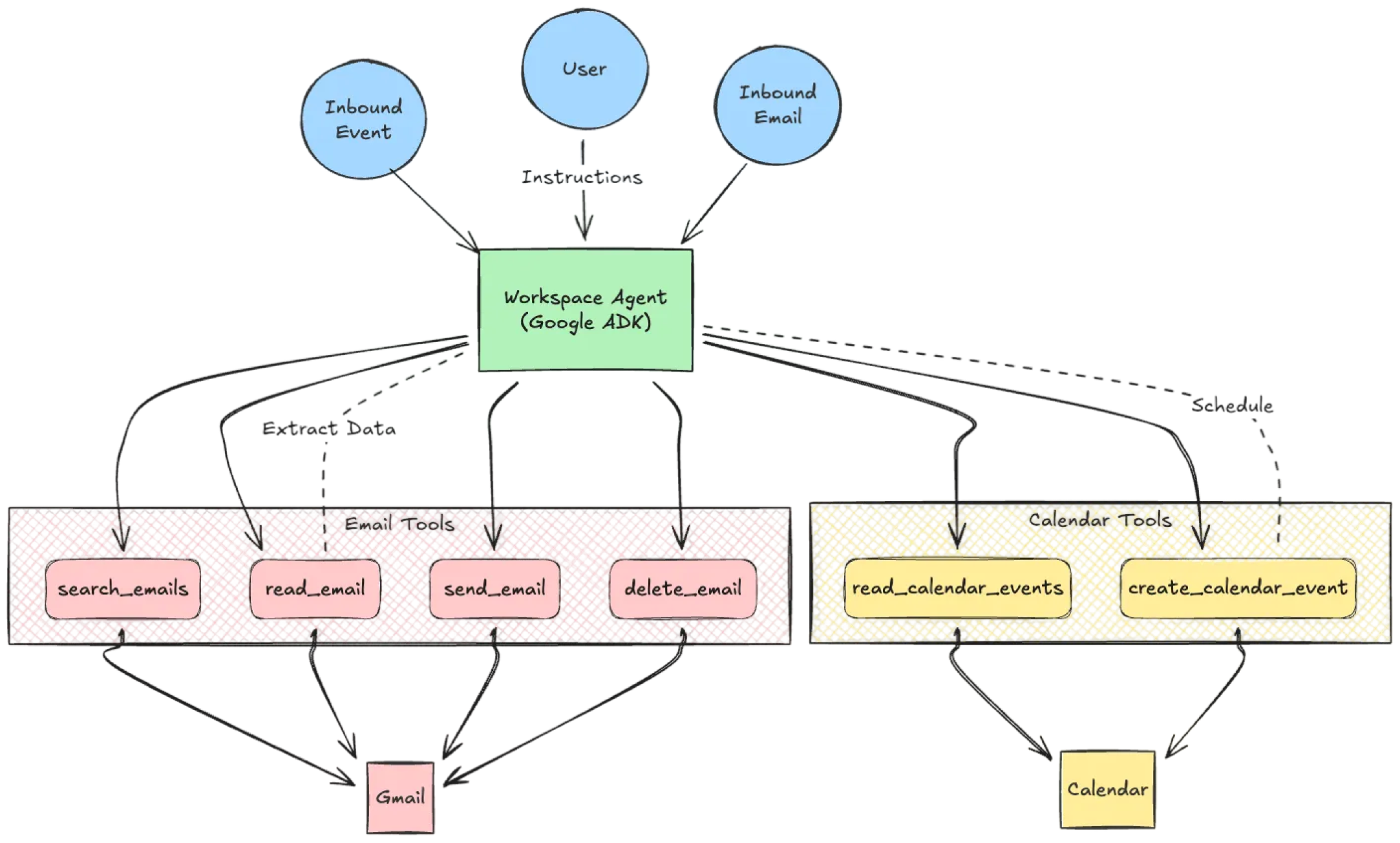 To understand the risk, let’s sketch a Workspace agent implemented in Agent Development Kit (ADK). It is a personal productivity assistant using an LLM reasoning model and native Python tools.