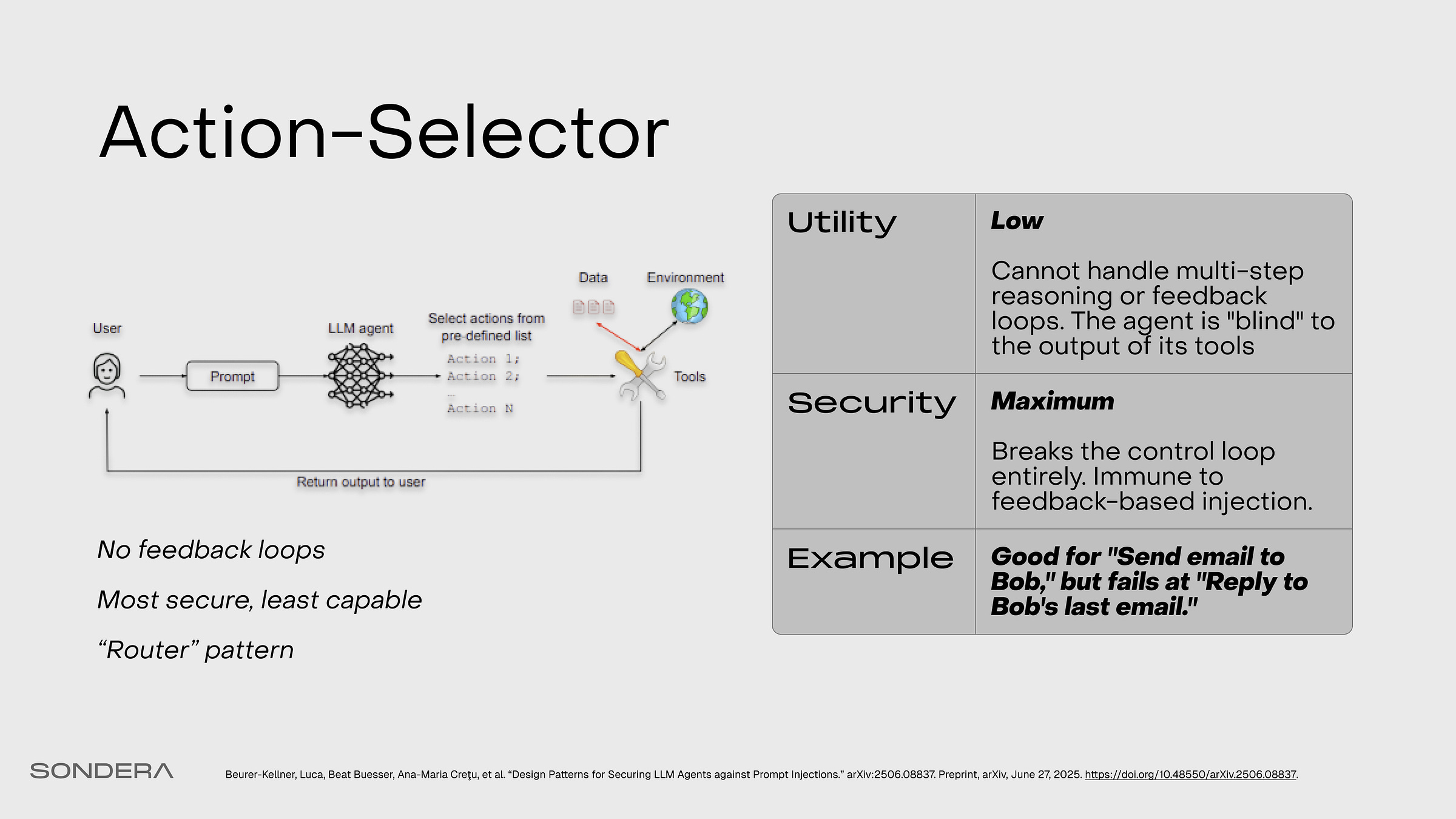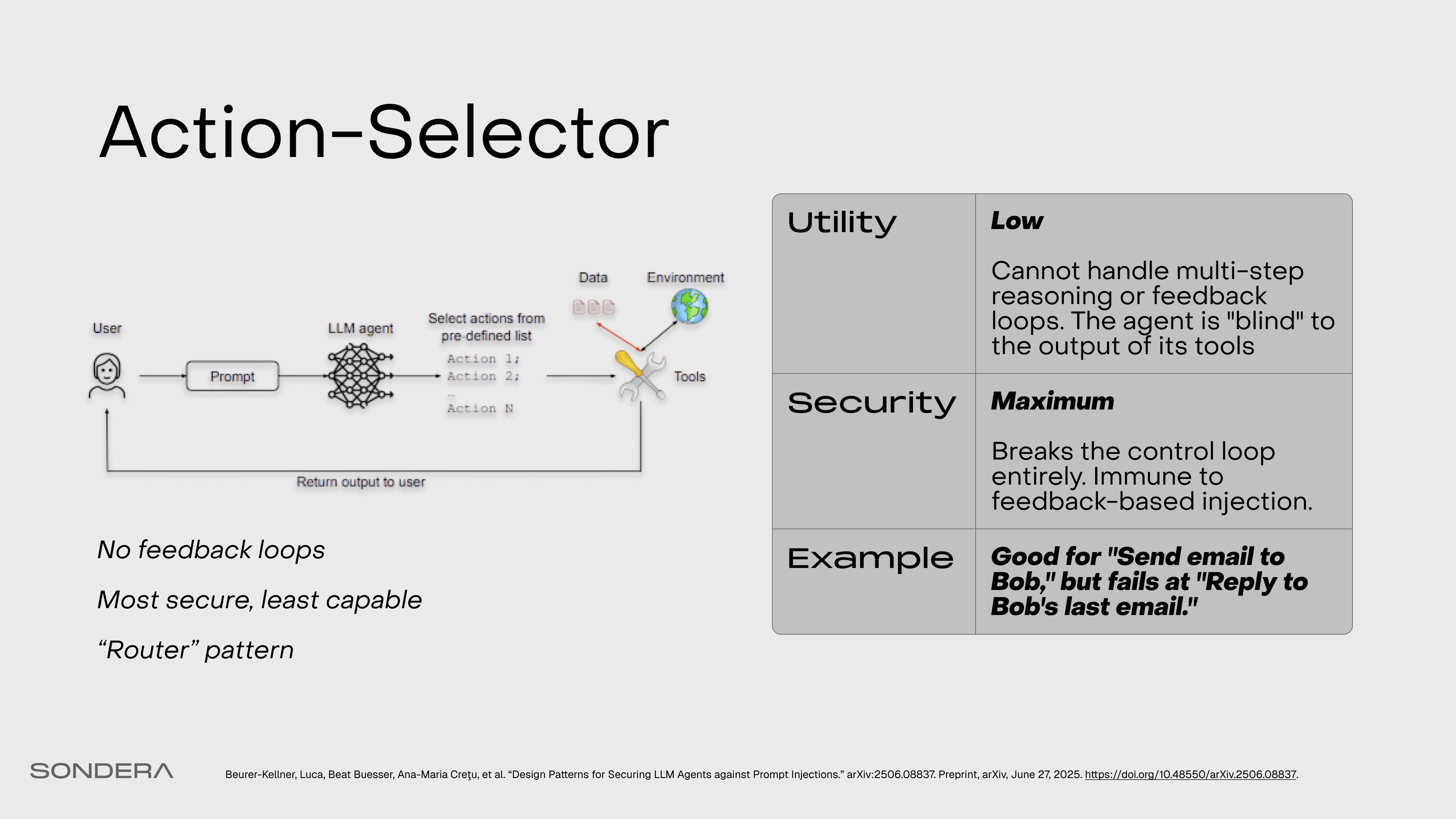 If you just want total safety, you can use this. It’s essentially a semantic router. It takes the user prompt and routes it to a predefined set of actions, and that’s it. There is no feedback loop. It can’t be tricked because it doesn’t actually use any of the data in the context. But it’s pretty restricted in capability.