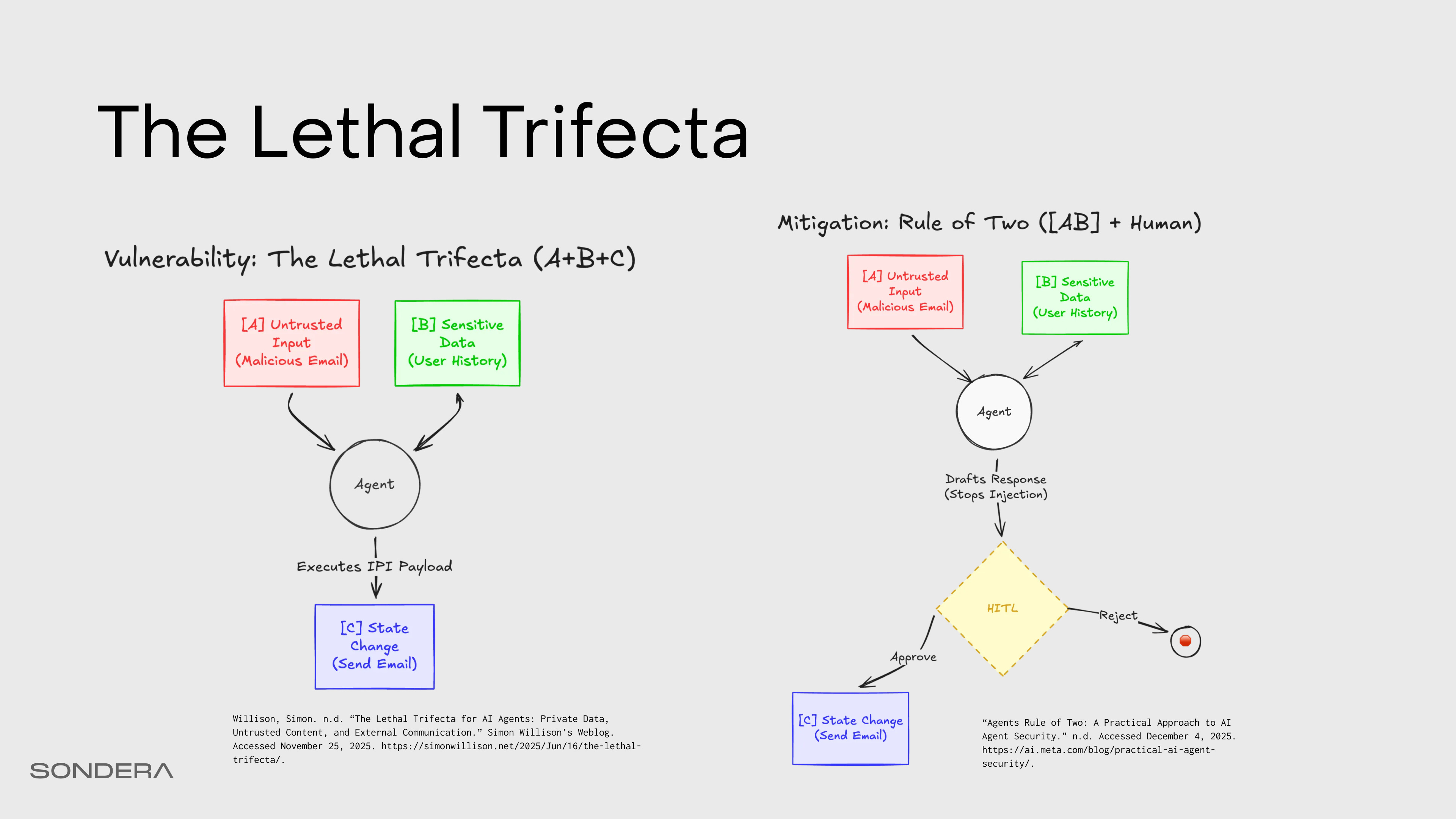 In a chatbot, prompt injection is offensive—it might produce harmful text, images, videos, etc. In an agent, prompt injection could be catastrophic. Because you gave the agent tools, injection doesn’t just produce text; it executes code, moves money, or exfiltrates files. A prompt injection vulnerability exists when three conditions are met: