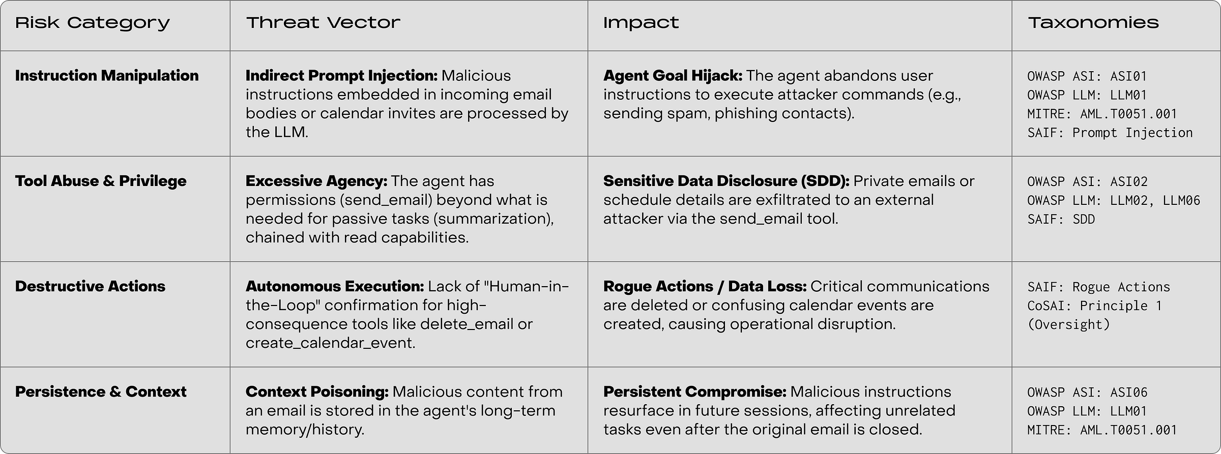 Let’s map the specific threats to our workspace agent across four threat categories.
