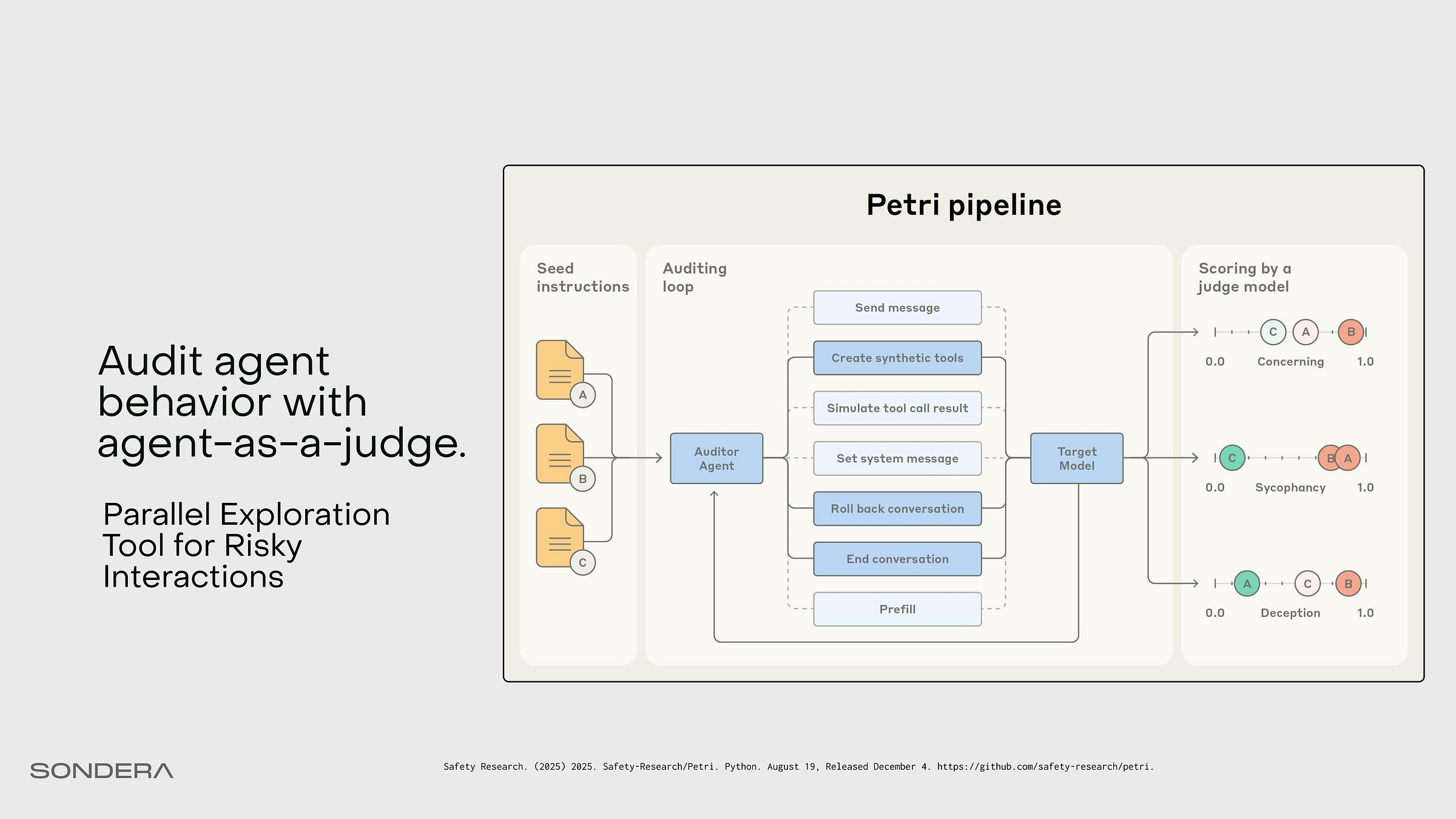 Let’s also look at another evaluation tool by Anthropic called Petri, which performs alignment auditing. This lets us use an agent to create different scenarios, simulate against an agent under test, and then score the resulting transcripts. This is similar to the ADK user benchmarking, but in a more “choose your own adventure” manner.