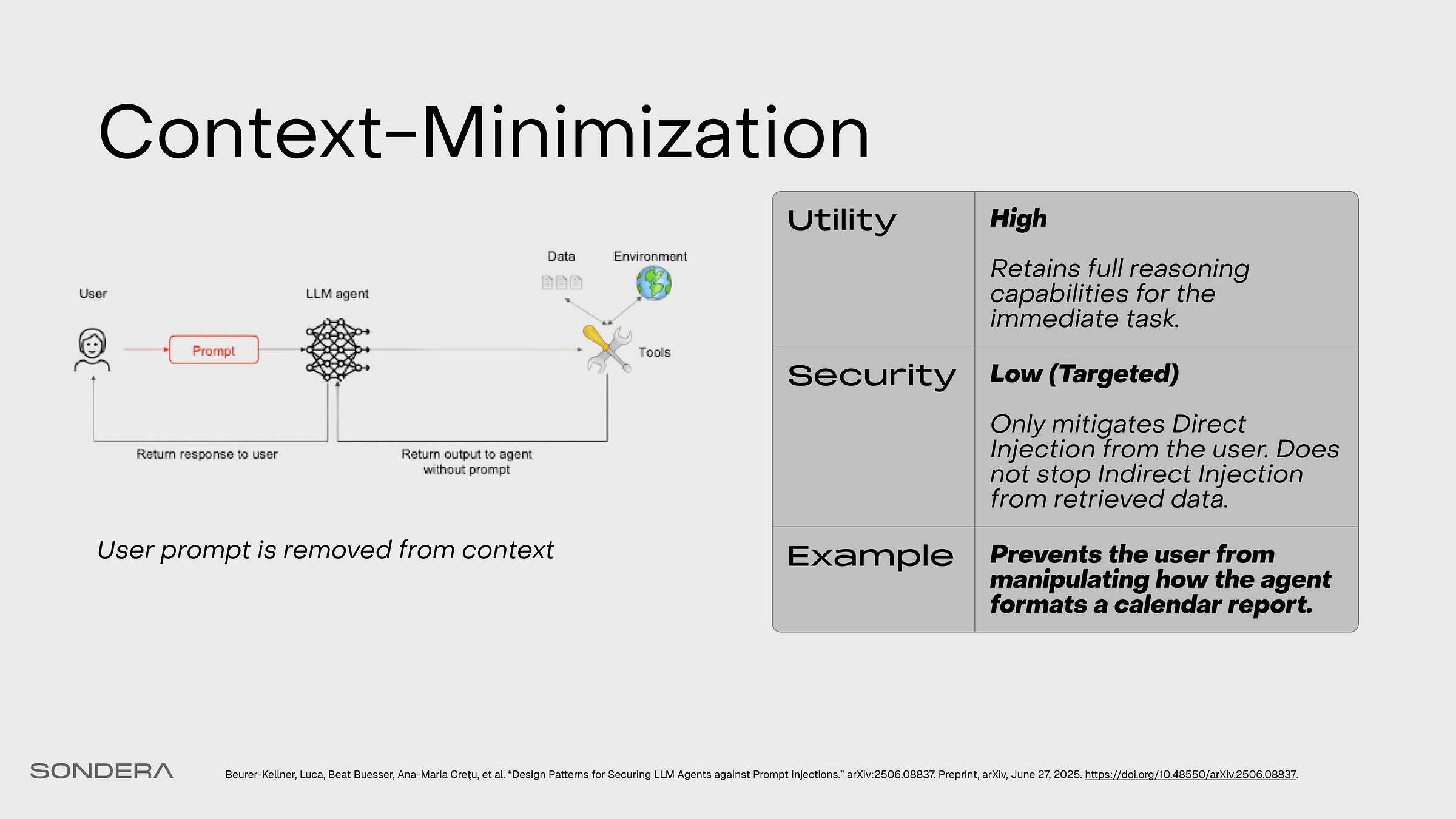 The user’s prompt is removed from the LLM’s context before it formulates its final response. This is effective against direct prompt injection but not the indirect attacks common in agentic workflows.
