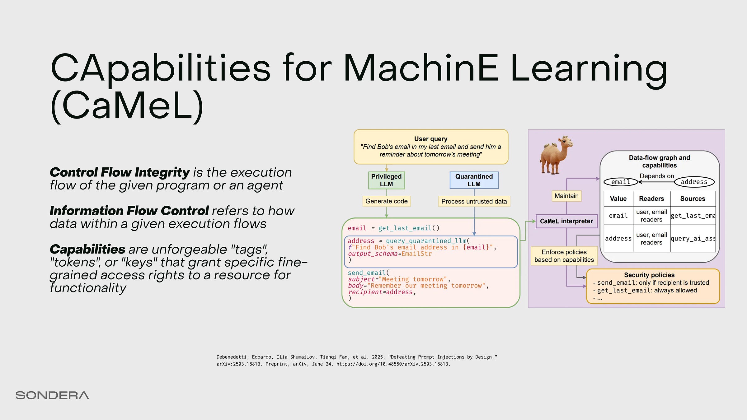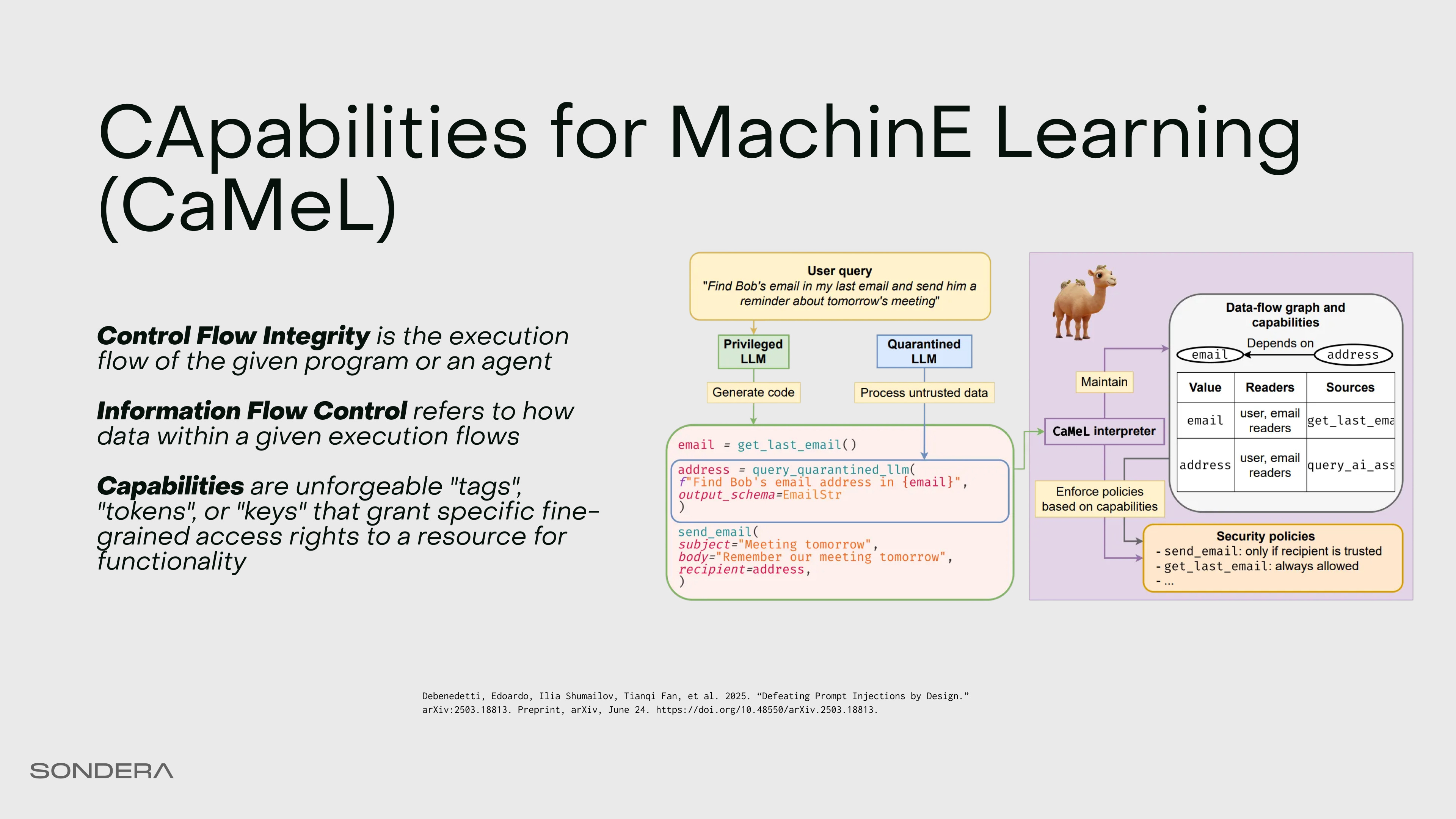 We’ll look at one specific instance of this called “Capabilities for Machine Learning” or CaMeL (Debenedetti et al. 2025). This came out earlier this year. This is how we can have our workspace agent fundamentally prevent leaking data by design.