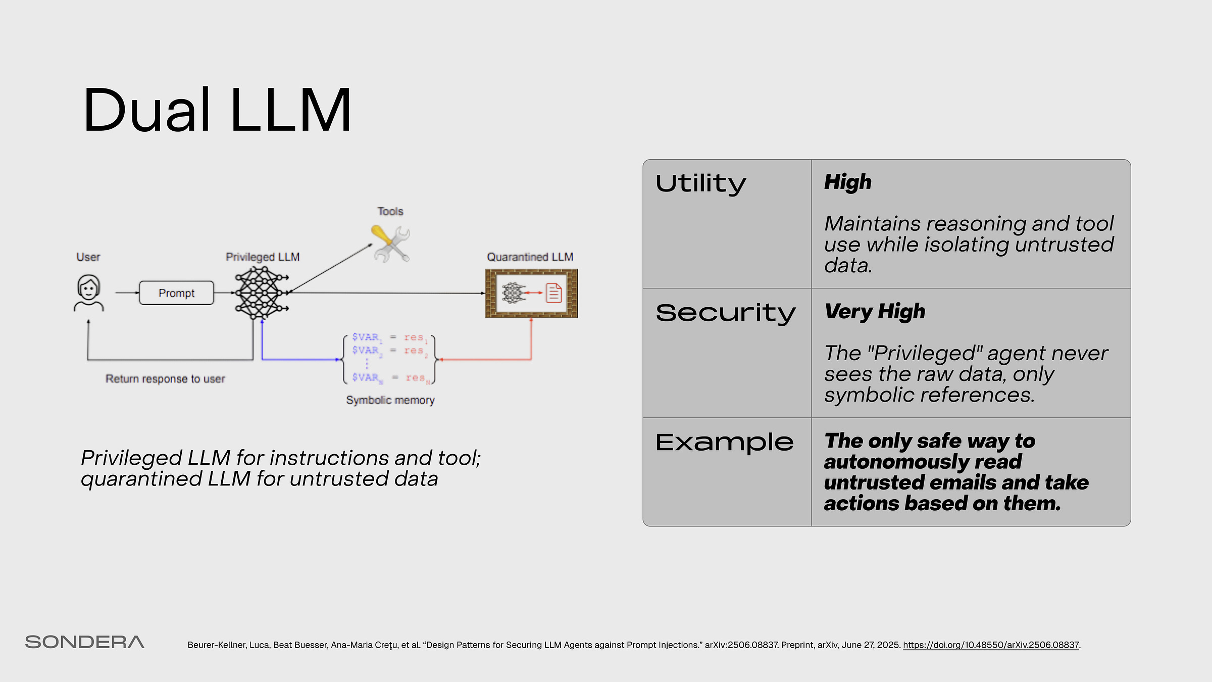 Then we have the Quarantined LLM (Q-LLM), which handles the data flow. It reads the untrusted email and processes potential prompt injection, but it does so inside a sandbox. It can’t execute code, and it can’t send emails. It can only output sanitized data back to the system.