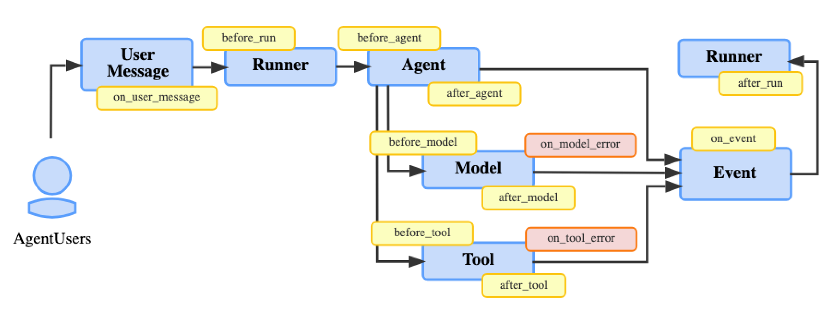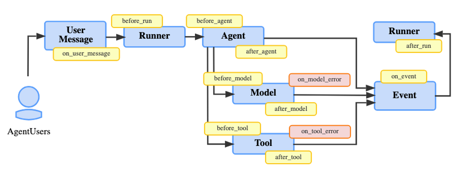 ADK provides a plugin framework with various agent lifecycle stages to implement monitoring, detection, and prevention guardrails. Other frameworks like Strands and LangGraph have similar hooks functions and middleware.