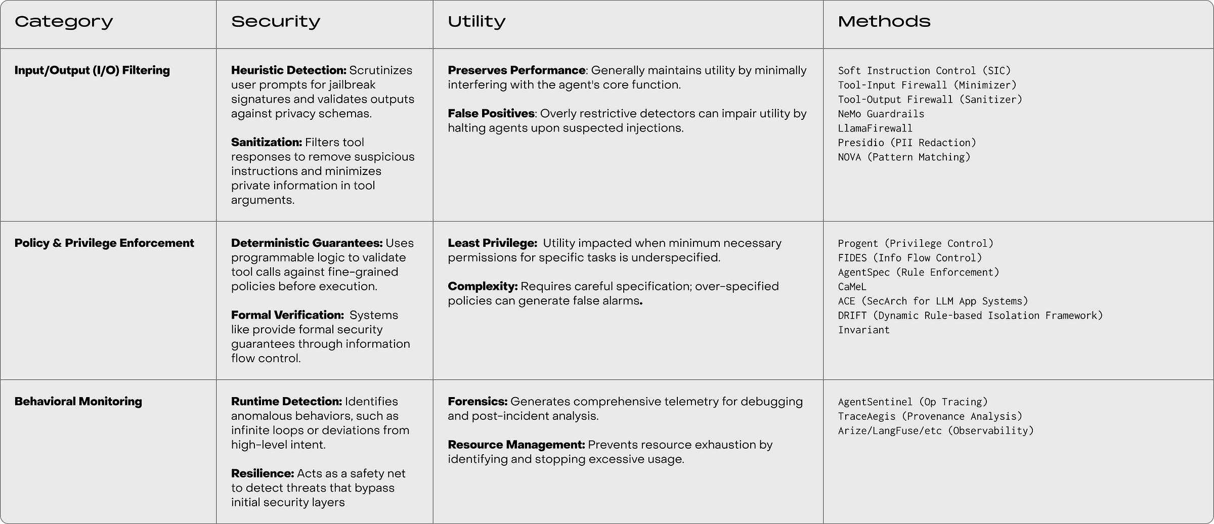 Guardrails offer runtime trade-offs between security, utility, and performance. We implement guardrails to operationalize trust. These are not one-size-fits-all. Some require deep integration into the agent’s harness; others use middleware, filtering the data at the edge.