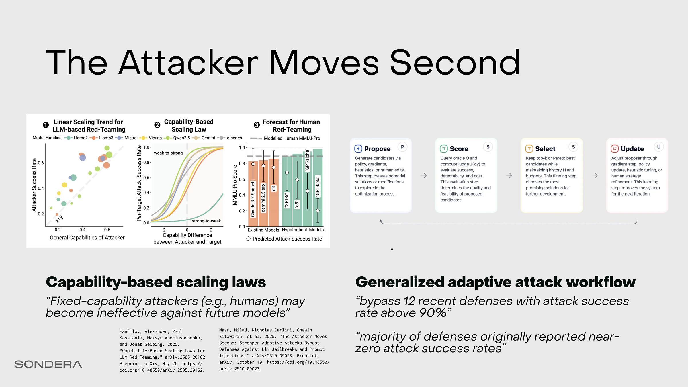 The attacker moves second and adapts attacks to defenses; attack success rates can be defined with scaling laws