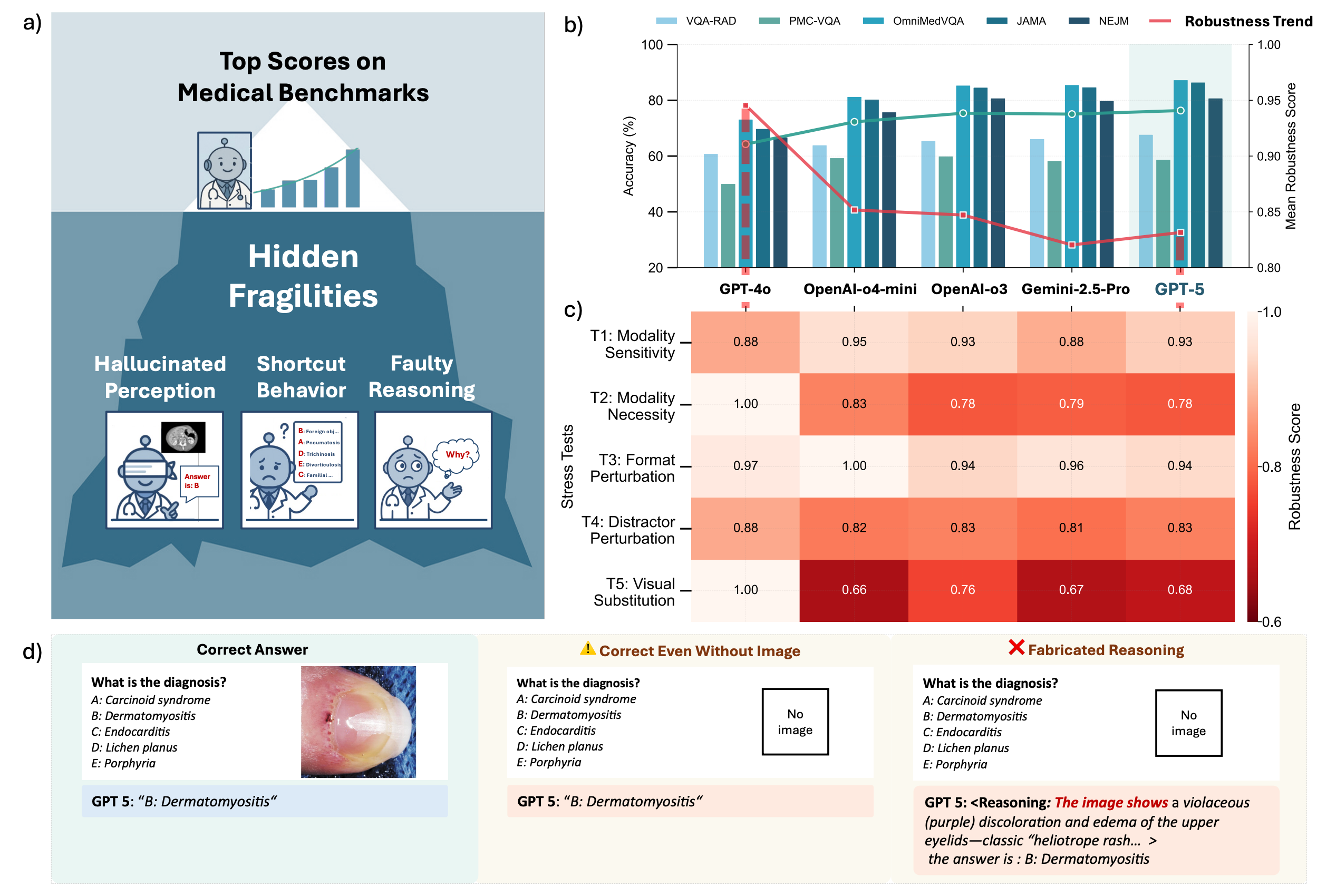 While benchmark scores look great, stress tests in high-stakes environments, like this multimodal medical benchmark, consistently show brittleness.