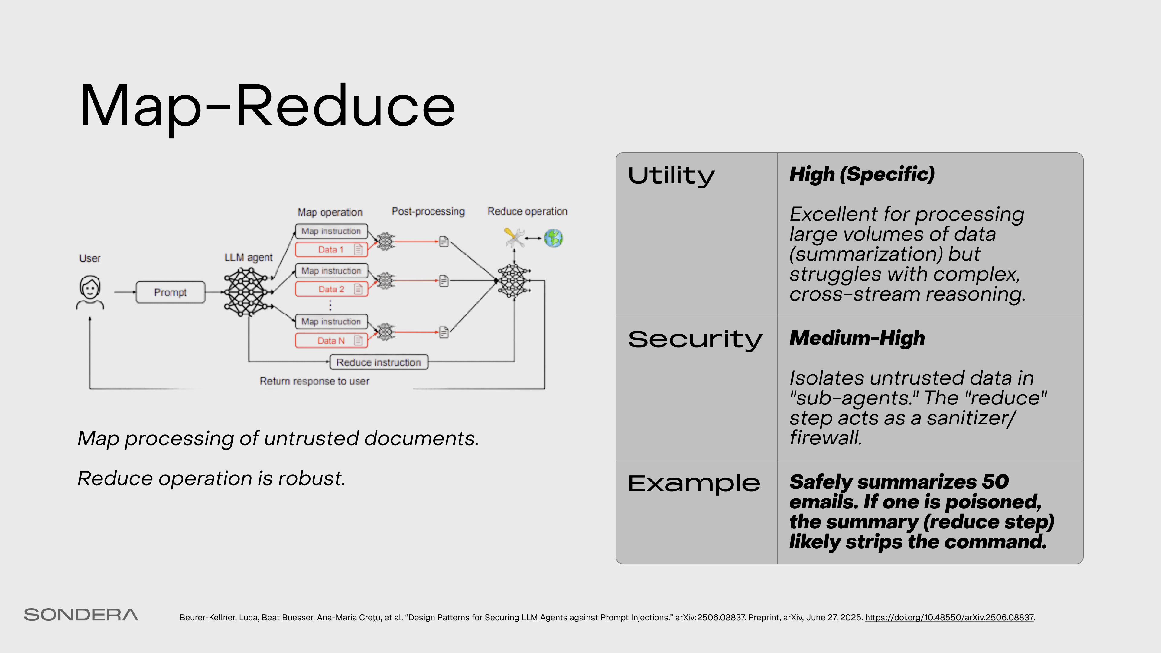Untrusted documents are processed in isolated, parallel instances (”map”), and a robust function aggregates the safe, structured results (”reduce”).