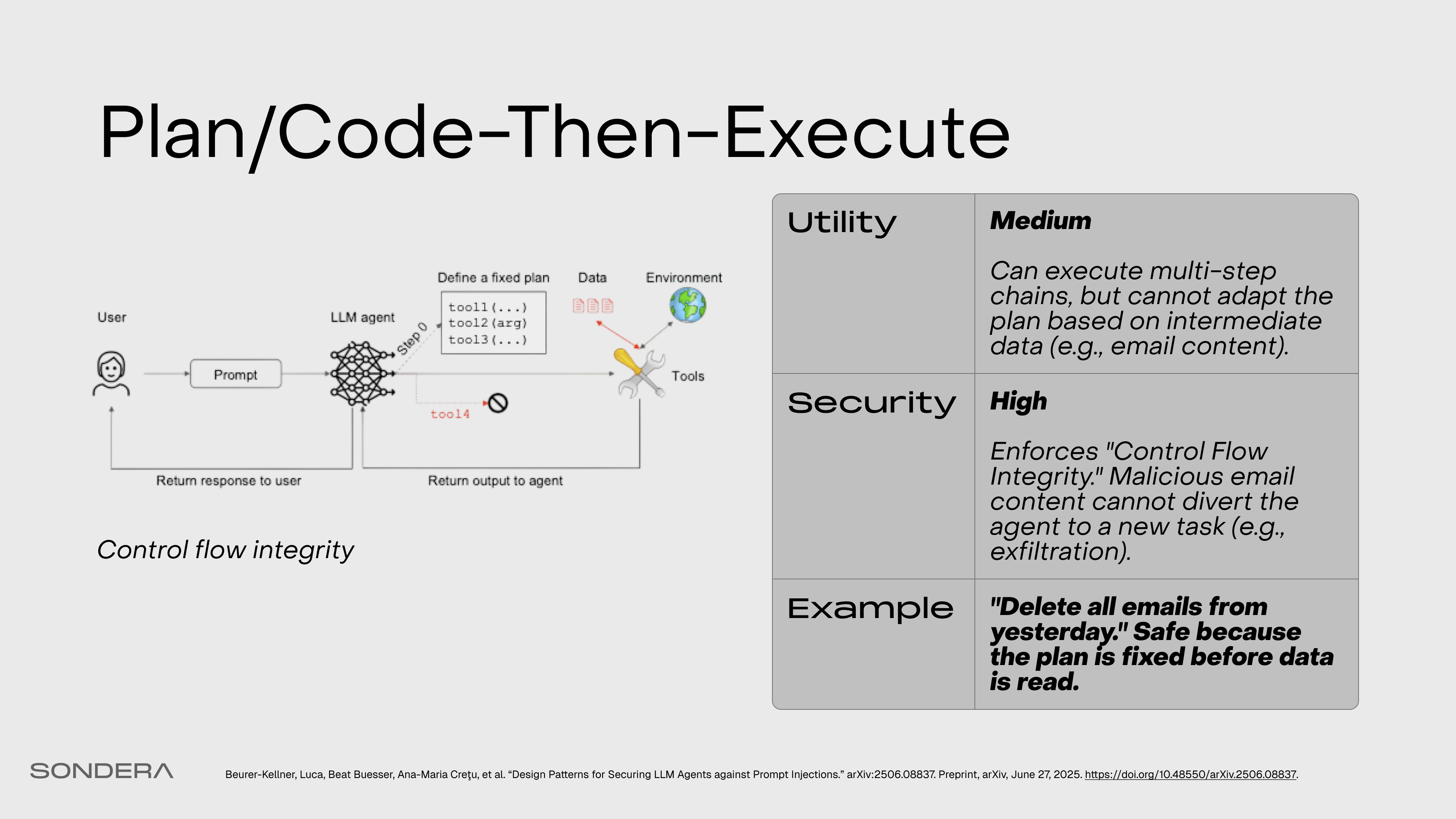 The agent first generates a fixed, static plan, then executes that plan without deviation. Code-Then-Execute does this with a generated formal program. This provides control flow integrity but reduces adaptability.